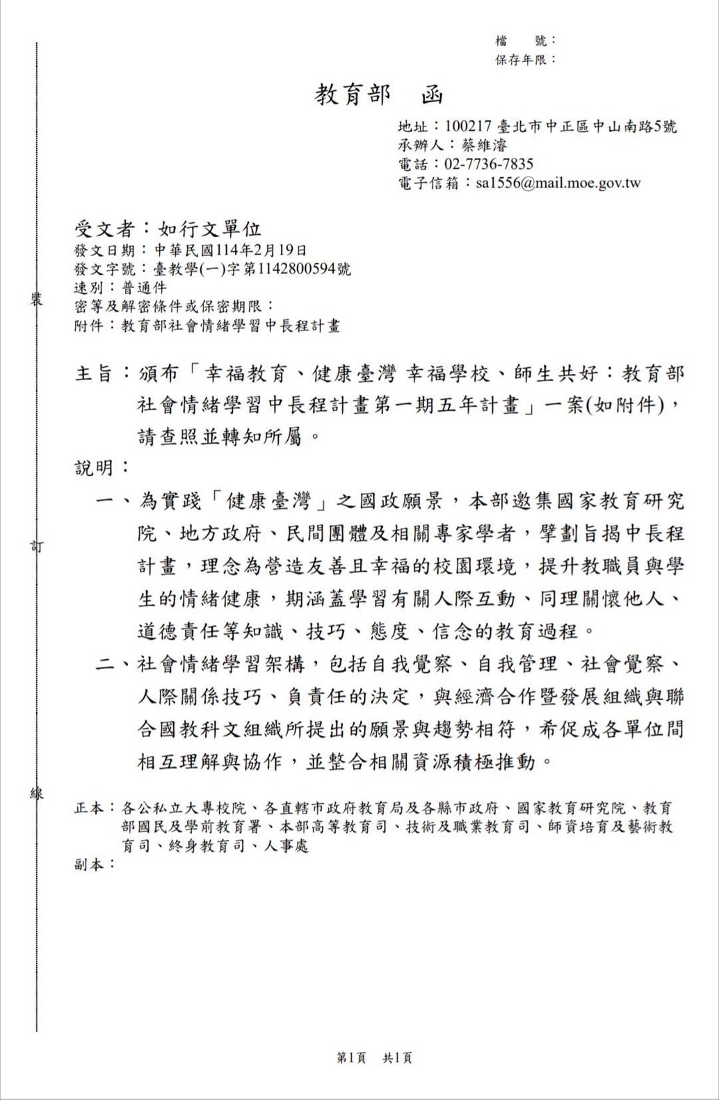 教育部頒布「幸福教育、健康臺灣 幸福學校、師生共好:教育部社會情緒學習中長程計畫第一期五年計畫」